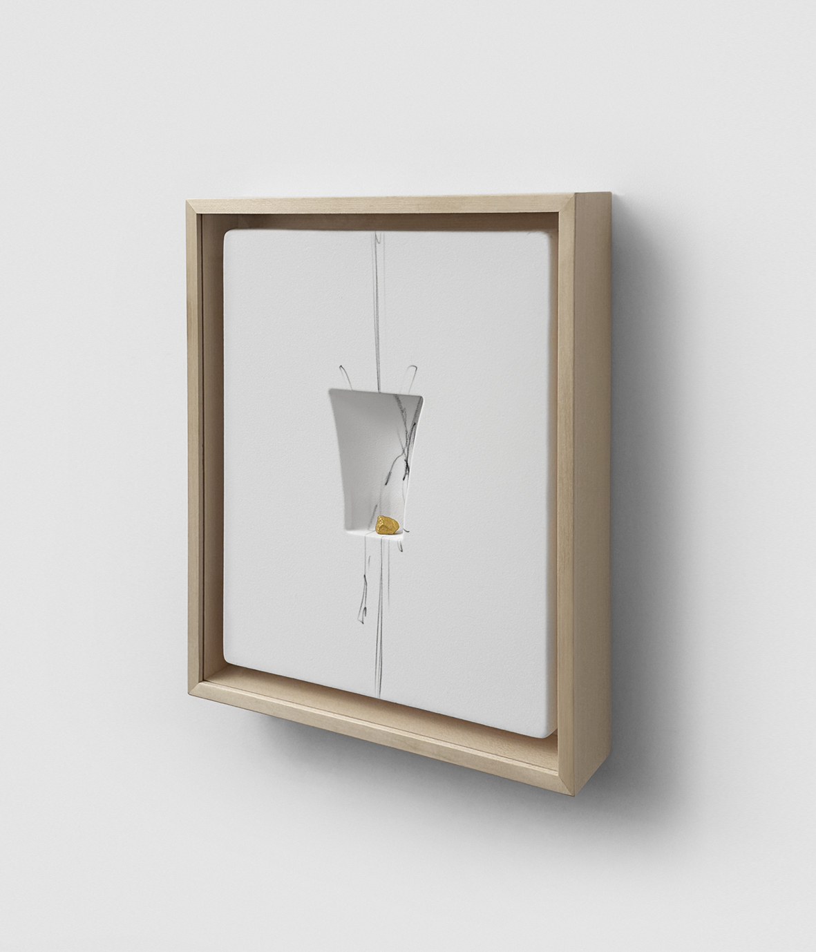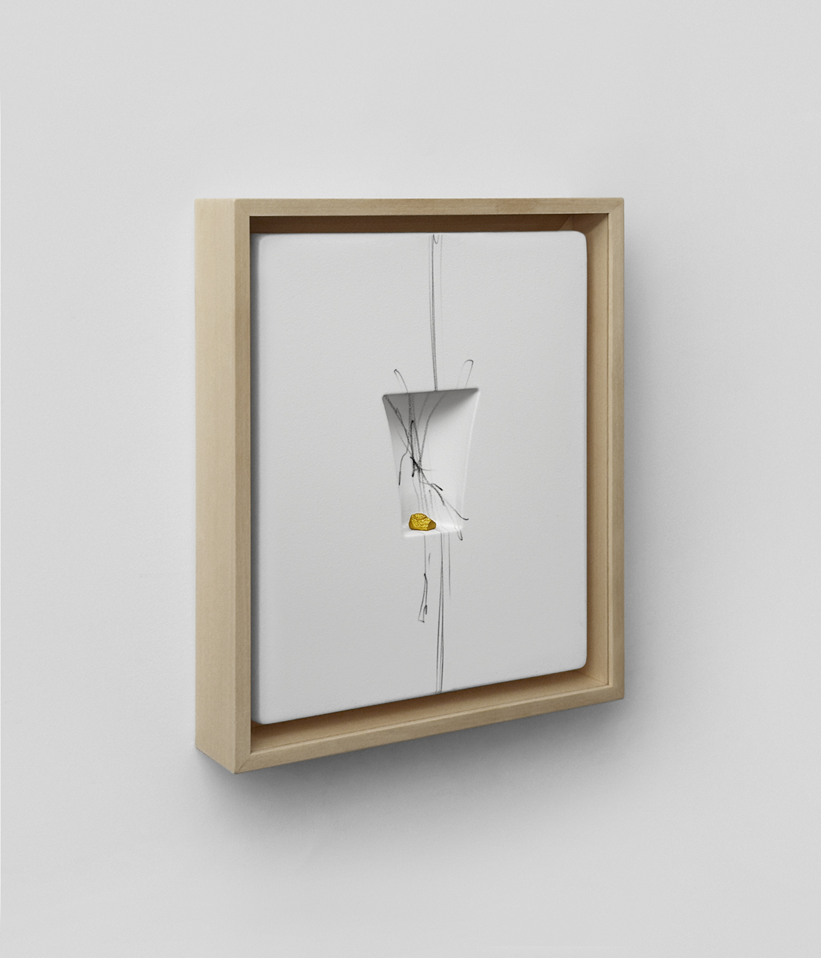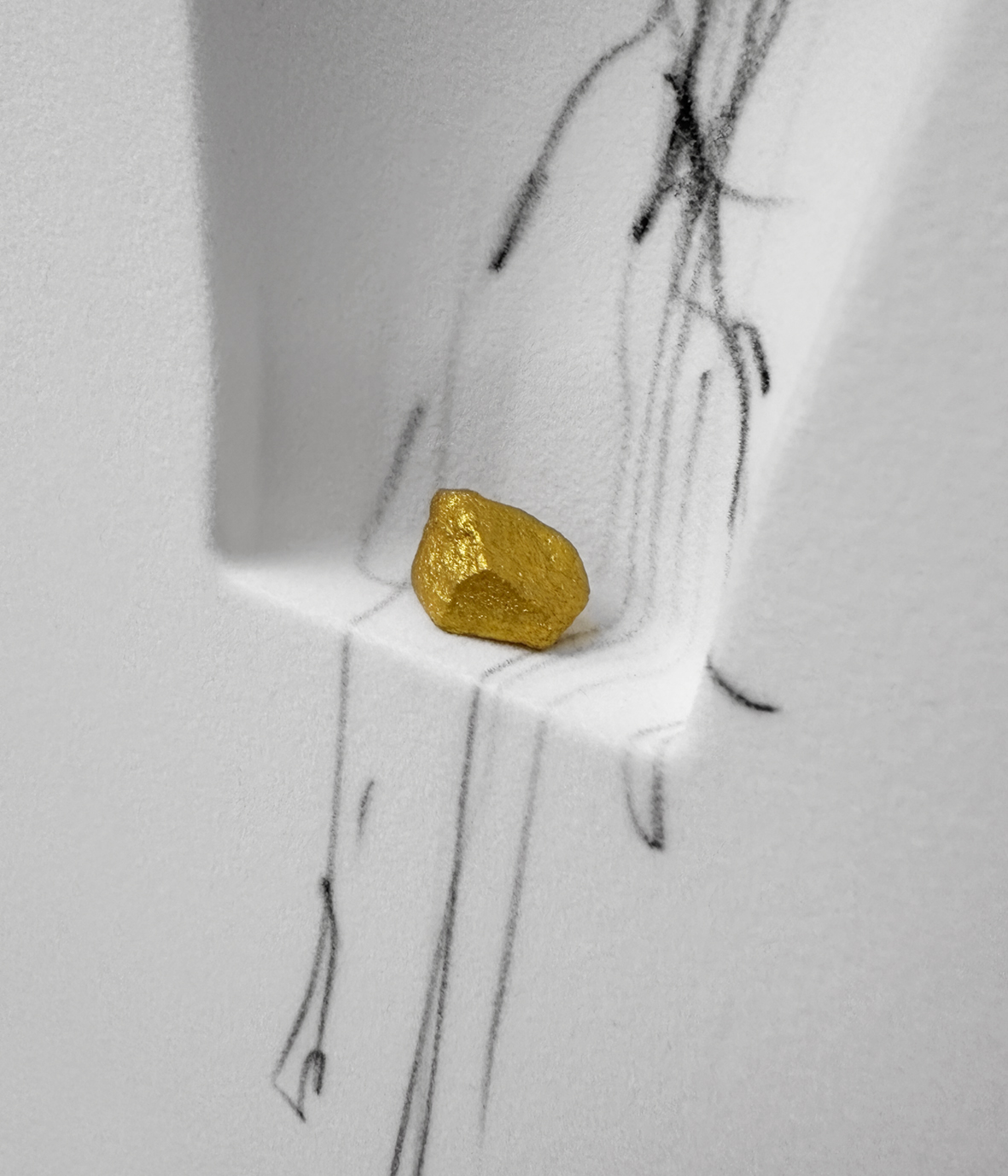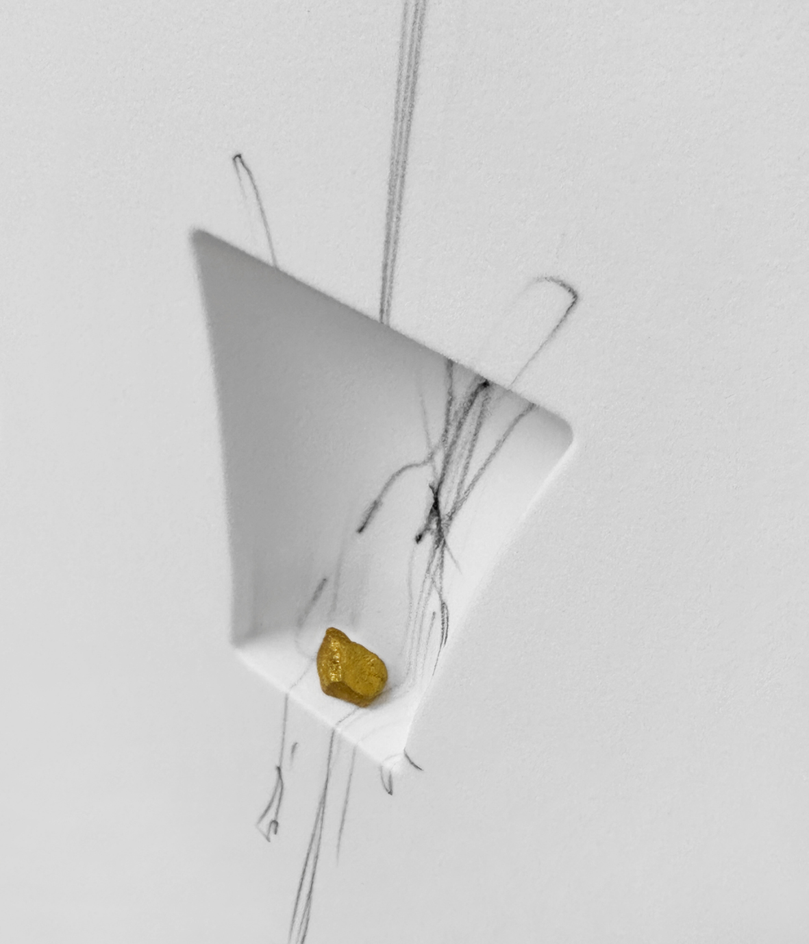 Untitled 2024, graphite, marble, enamel, gold on thermoformed flocked polystyrene, cm 25x30x4